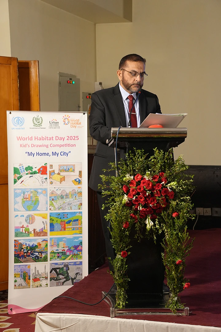 Mr. Jawed Ali Khan, Senior Advisor HMP, UN-Habitat, delivered the welcome remarks, emphasizing the importance of this year’s theme. Reflecting on the recent floods and recurring disasters in Pakistan, he underlined the vulnerability of the urban poor—who make up a majority of the population—and called for modern planning, resilience initiatives, and practical urban solutions to counter the climate crisis.
